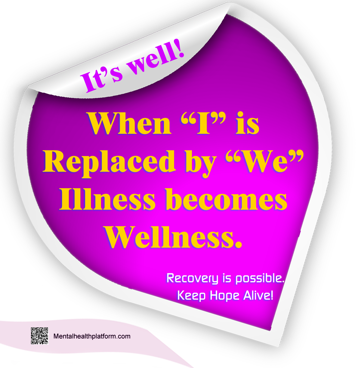 Posted on October 23, 2013 by Mental Perspective Reply It’s Well. … When “I” is Replaced by “We” Illness becomes Wellness. Recovery is Possible. Keep Hope Alive ! (Karen Byfield) Share this: Click to share on X (Opens in new window) X Click to share on Facebook (Opens in new window) Facebook Like Loading... Related