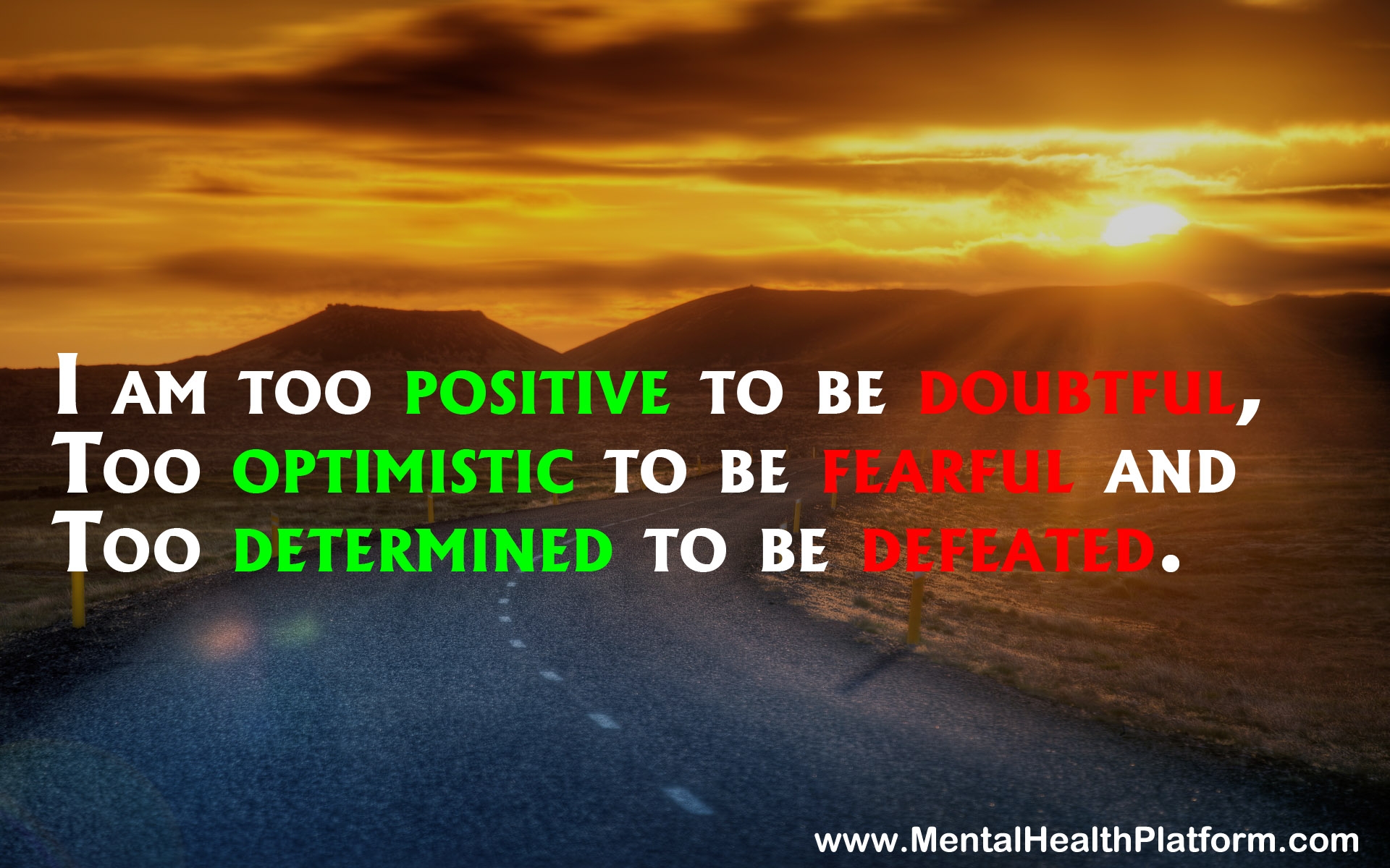 Posted on January 16, 2014 by Mental Perspective Reply Stay Positive!… Stay Positive! I am too positive to be doubtful, too optimistic to be fearful and too determined to be defeated. Share this: Click to share on X (Opens in new window) X Click to share on Facebook (Opens in new window) Facebook Like Loading... Related
