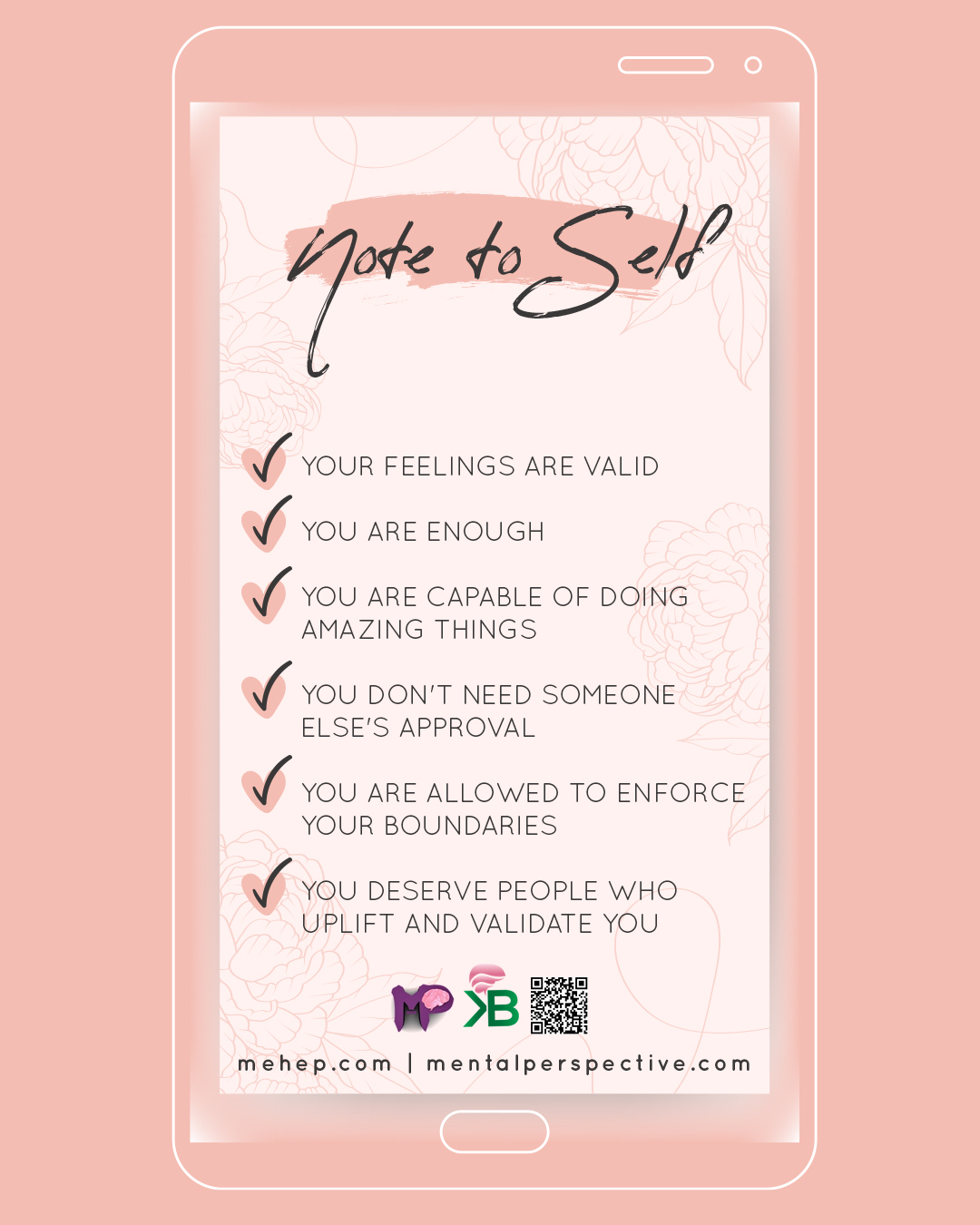 Posted on April 13, 2021 by Mental Perspective Reply Note to Self – Positive Inspiration ~You are enough ~Your feelings are valid ~You are capable of doing amazing things ~You are allowed to enforce your boundaries ~You deserve people who uplift and validate you Share this: Click to share on X (Opens in new window) X Click to share on Facebook (Opens in new window) Facebook Like Loading... Related