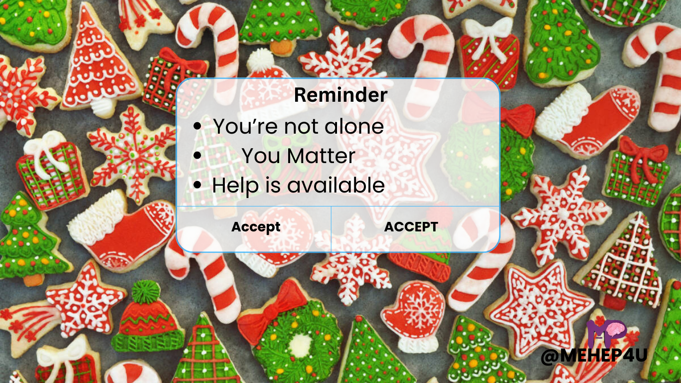 Featured Post By Mental Perspective Reply Reminder: Reach Out. It can be a tough time for some people during this season. Please remember to reach out if you need help. ~ You matter ~ Help is available ~ You are not alone ~ Karen B. Share this: Click to share on X (Opens in new window) X Click to share on Facebook (Opens in new window) Facebook Like Loading... Related