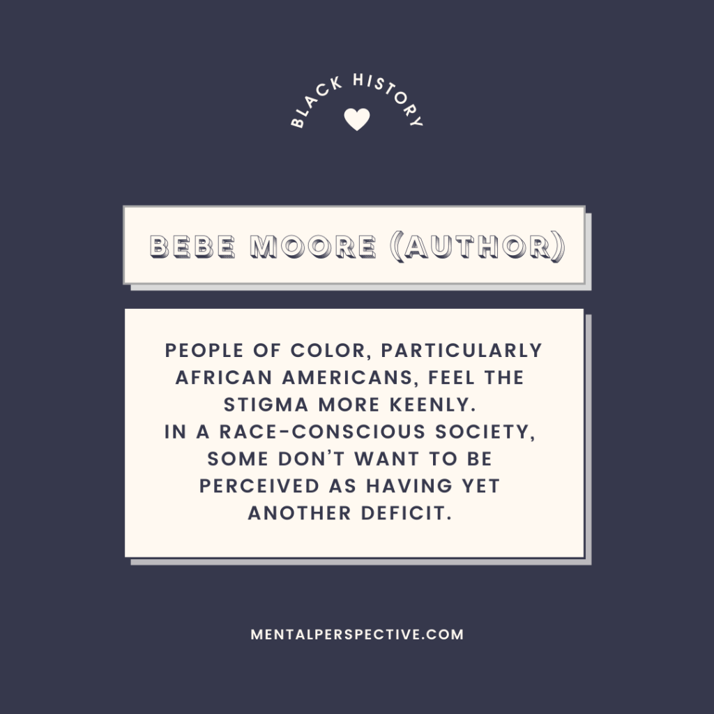 - Quote: People of colour, particularly African Americans, feel the stigma more keenly. In a race-conscious society sme don’t want to be perceived as having yet another deficit. ~ Bebe Moore (Author).