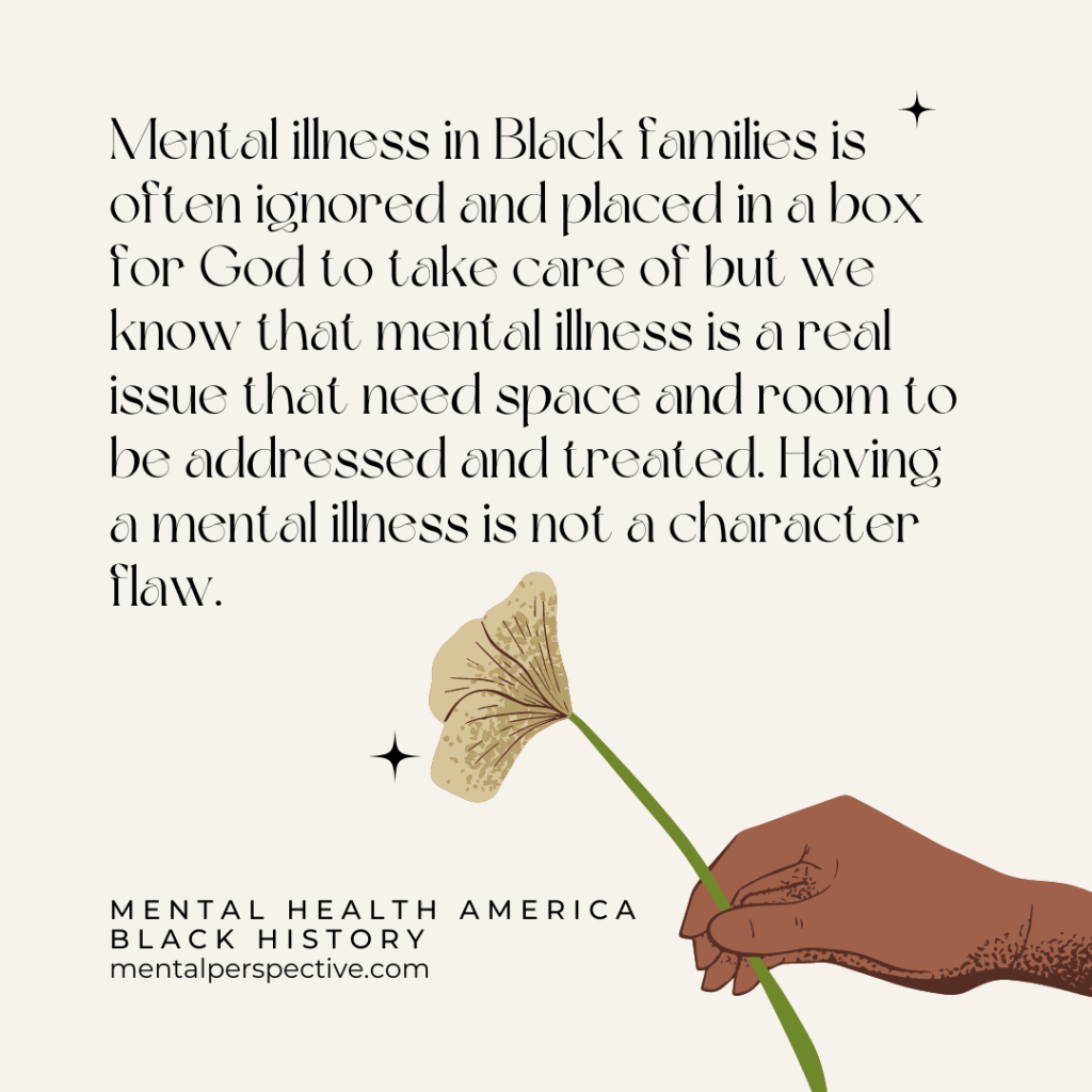 2. Quote: “Mental illness in Black families is often ignored and placed in a box for God to take care of, but we know that mental illness is a real issue that needs space and room to be addressed and treated. Having a mental illness is not a character flaw.”