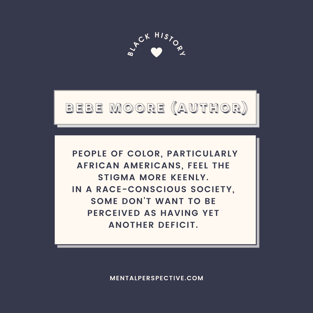 - Quote: People of colour, particularly African Americans, feel the stigma more keenly. In a race-conscious society sme don’t want to be perceived as having yet another deficit. ~ Bebe Moore (Author).
